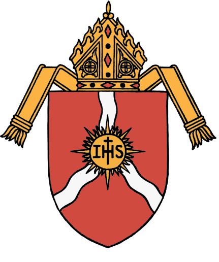 The shield of the Diocese of Shreveport is composed of a red field to represent the Red River that runs through the See City. On this red field ā is a gold sunburst charged with the monogram of the Holy Name (IHS). This symbolism is employed here to represent Saint John Berchmans, titular of the Cathedral Church. From the sunburst issue three wavy bars to represent the three rivers that run through the dioceseāthe Red, the Mississippi, and the Ouachitaāand to represent the waters of Baptism that flow from God, Our Father, to save all mankind.