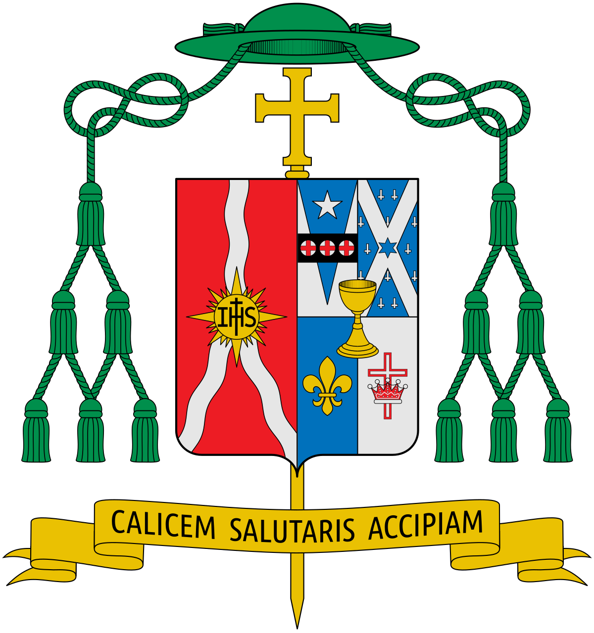 The device is completed with the external ornaments which are a gold episcopal processional cross (with a Celtic cross at its center) which is placed in back of the shield. Also at the top, is a pontificate hat, called a āgalleroā with its six tassels, in three rows, on either side of the shield, all green. These are the heraldic insignia of a prelate of the rank of bishop by instruction of the Holy See of March 31, 1969