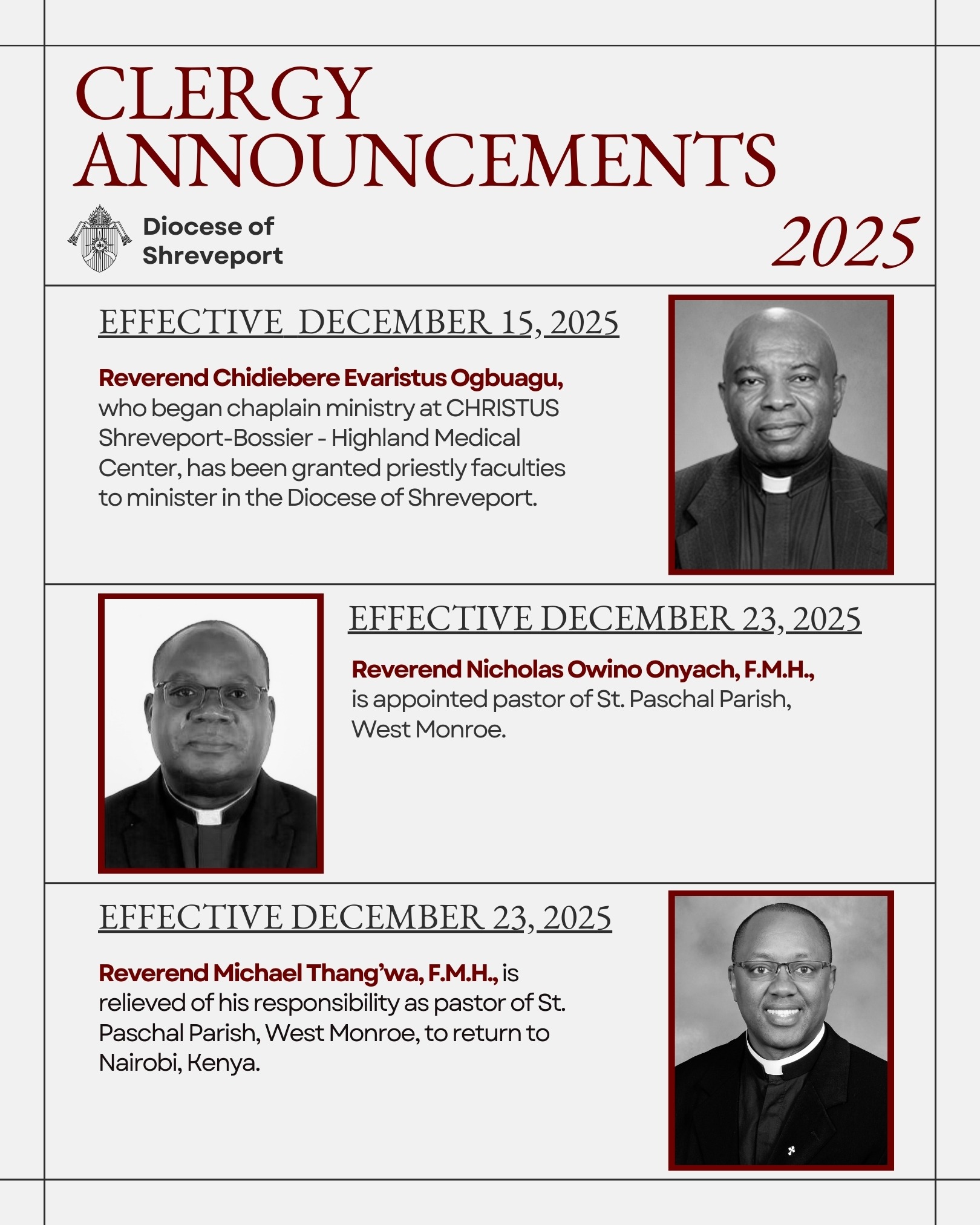 Reverend Michael Thang’wa, F.M.H. is relieved of his responsibility as pastor of St. Paschal Parish, West Monroe, to return to Nairobi, Kenya.”