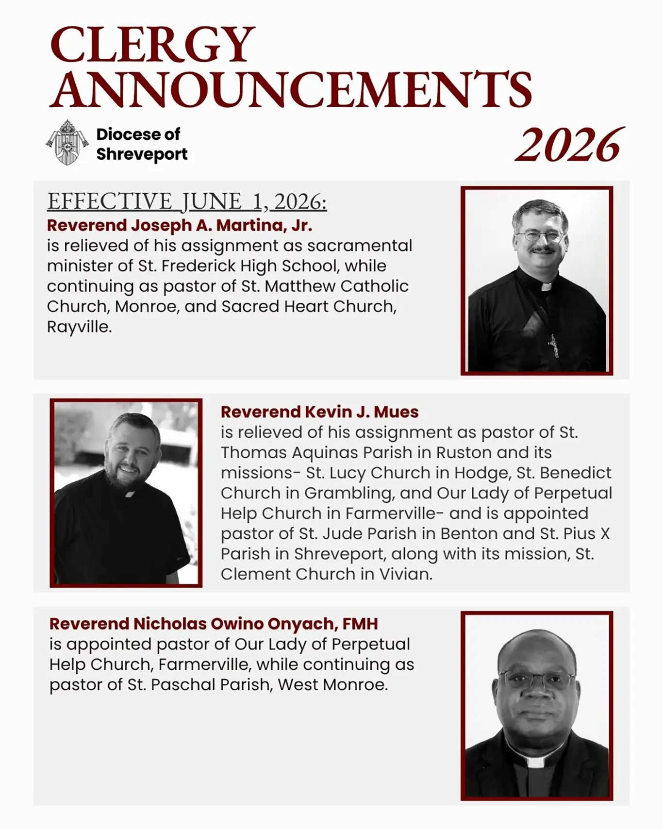 Reverend Kevin J. Mues is relieved of his assignment as pastor of St. Thomas Aquinas Parish in Ruston and its missions- St. Lucy Church in Hodge, St. Benedict Church in Grambling, and Our Lady of Perpetual Help Church in Farmerville- and is appointed pastor of St. Jude Parish in Benton and St. Pius X Parish in Shreveport, along with its mission, St. Clement Church in Vivian.