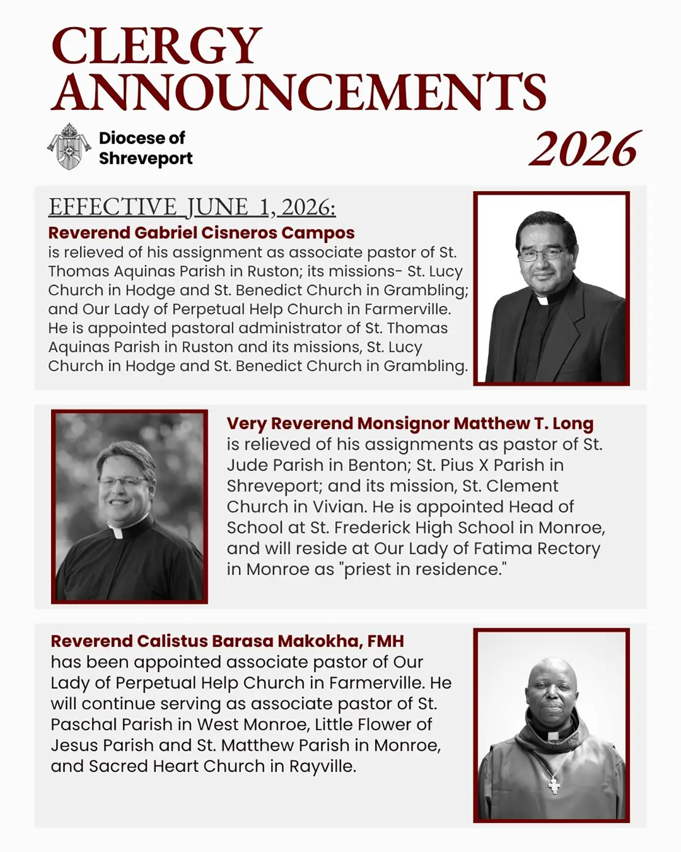 Reverend Gabriel Cisneros Campos is relieved of his assignment as associate pastor of St. Thomas Aquinas Parish in Ruston; its missions- St. Lucy Church in Hodge and St. Benedict Church in Grambling; and Our Lady of Perpetual Help Church in Farmerville. He is appointed pastoral administrator of St. Thomas Aquinas Parish in Ruston and its missions, St. Lucy Church in Hodge and St. Benedict Church in Grambling.