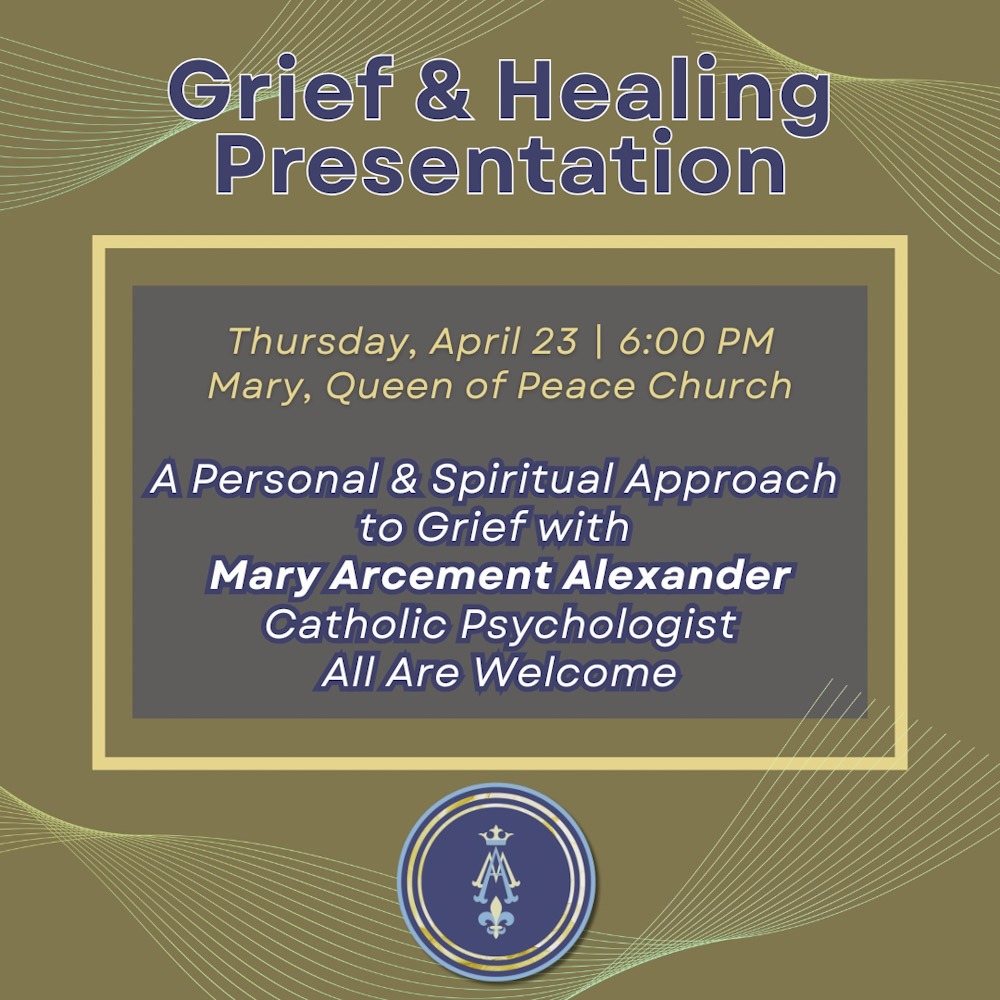 Join us on Thursday, April 23 at 6:00 PM at Mary, Queen of Peace for a special presentation by Mary Arcement Alexander, a local Catholic psychologist, as she offers guidance on navigating grief from both a personal and spiritual perspective.