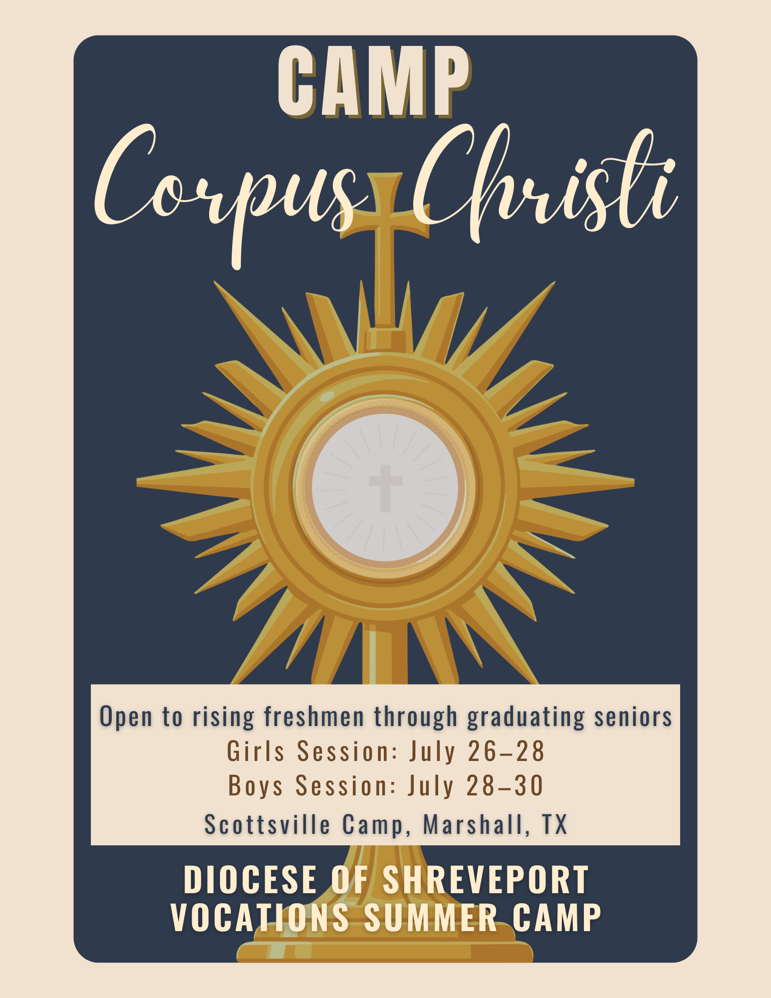 Camp Corpus Christi is an all-new summer experience with a renewed vision and energy. Centered on the power and presence of Jesus in the Blessed Sacrament, this diocesan camp is dedicated to helping our young people discover their unique place in the Body of Christ.